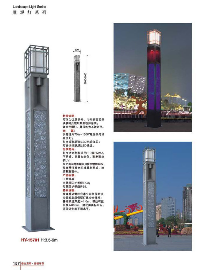 用途:景觀燈適用市政工程、園林亮化工程和公園、開發(fā)區(qū)、別墅區(qū)、廣場等戶外路燈照明工程
