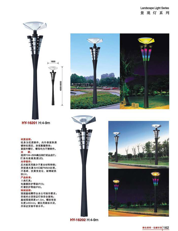 用途:景觀燈適用市政工程、園林亮化工程和公園、開發(fā)區(qū)、別墅區(qū)、廣場(chǎng)等戶外路燈照明工程