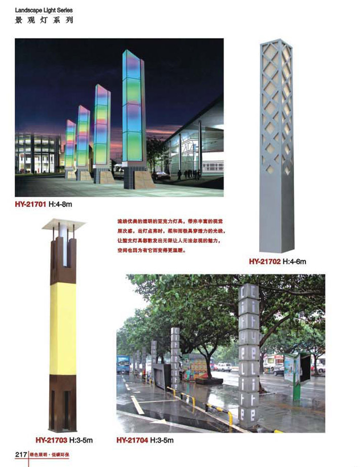 用途:景觀燈適用市政工程、園林亮化工程和公園、開發(fā)區(qū)、別墅區(qū)、廣場等戶外路燈照明工程