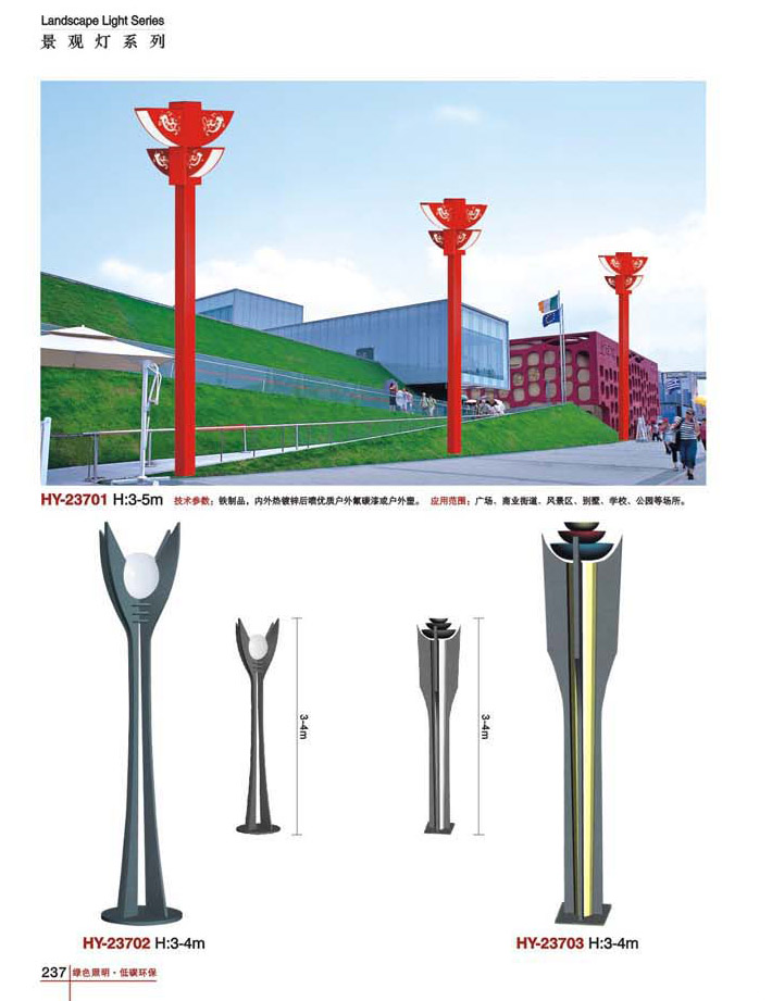 用途:景觀燈適用市政工程、園林亮化工程和公園、開(kāi)發(fā)區(qū)、別墅區(qū)、廣場(chǎng)等戶外路燈照明工程