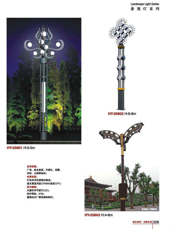 用途:景觀燈適用市政工程、園林亮化工程和公園、開發(fā)區(qū)、別墅區(qū)、廣場等戶外路燈照明工程