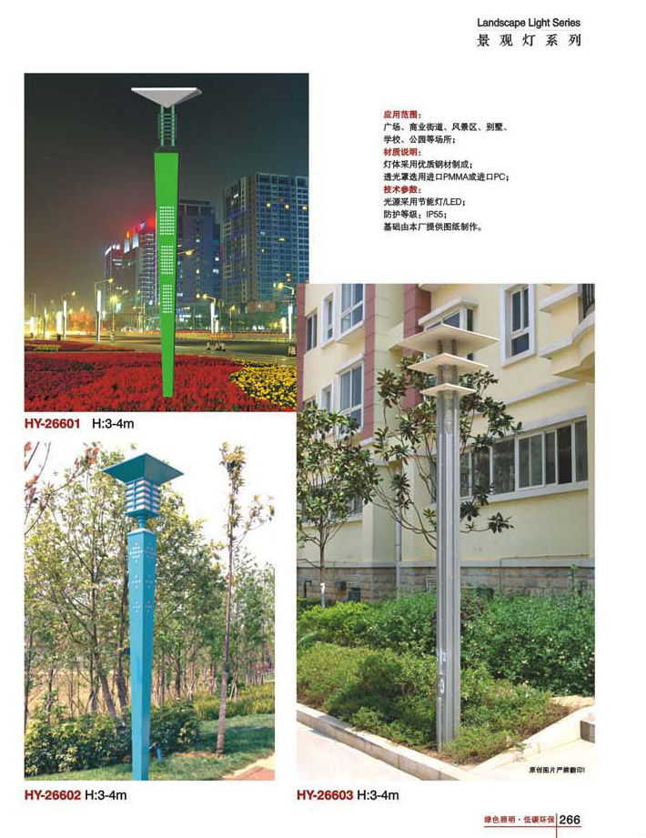 用途:景觀燈適用市政工程、園林亮化工程和公園、開發(fā)區(qū)、別墅區(qū)、廣場等戶外路燈照明工程