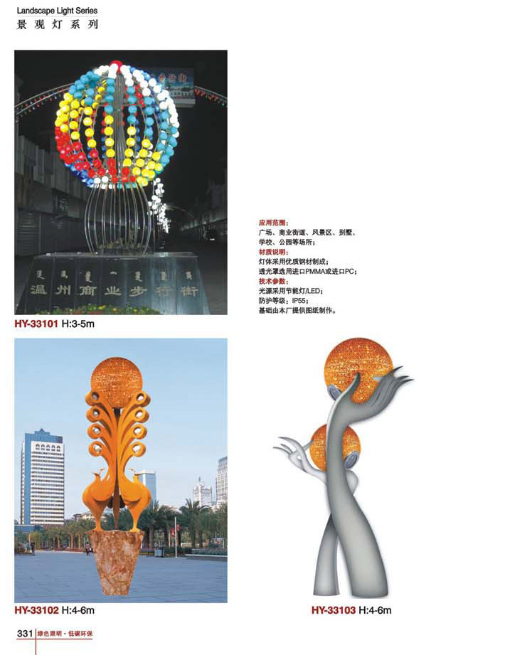 用途:景觀燈適用市政工程、園林亮化工程和公園、開發(fā)區(qū)、別墅區(qū)、廣場等戶外路燈照明工程